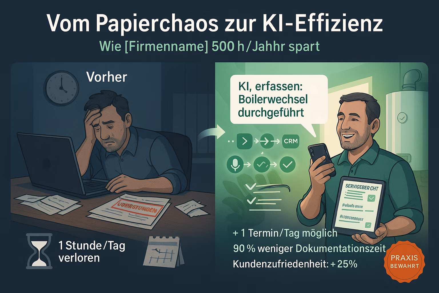 Vor kurzem habe ich mit einem Installationsunternehmen zusammengearbeitet, das genau dieses System eingeführt haS. Die Techniker mussten früher täglich mindestens eine Stunde für die Nachbearbeitung ihrer Termine aufwenden. Durch die Integration einer KI-gestützten Sprachsoftware konnte dieser Prozess nahezu komplett automatisiert werden.